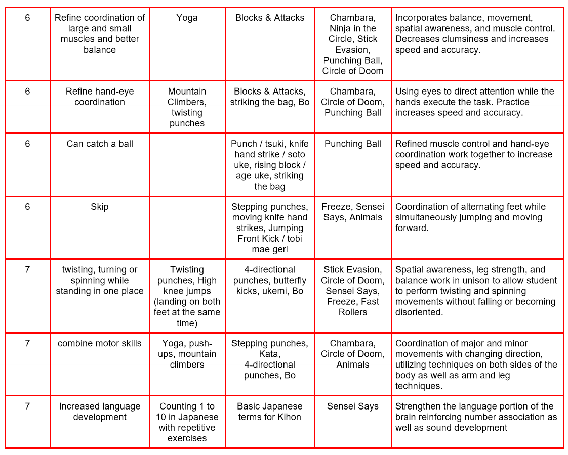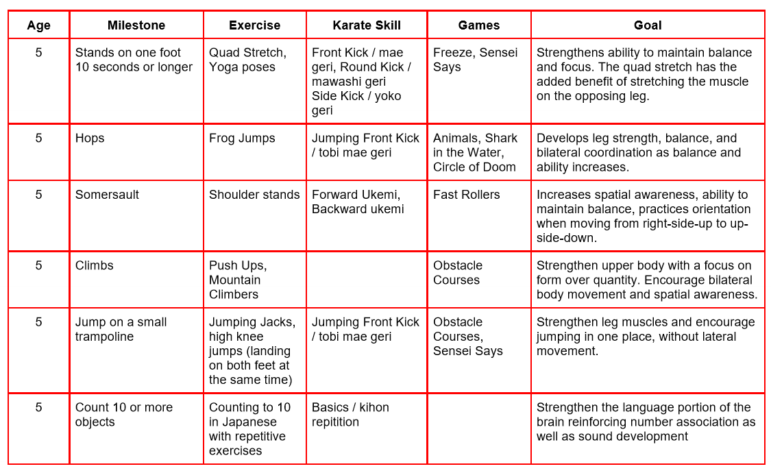 This list of milestones is not all encompassing. These milestones are common ones that may be looked for when a child is evaluated by their pediatrician at an annual well visit. The goal is to encourage and strengthen development through movement, integrating martial arts practices to strengthen the whole child, not just the physical child.